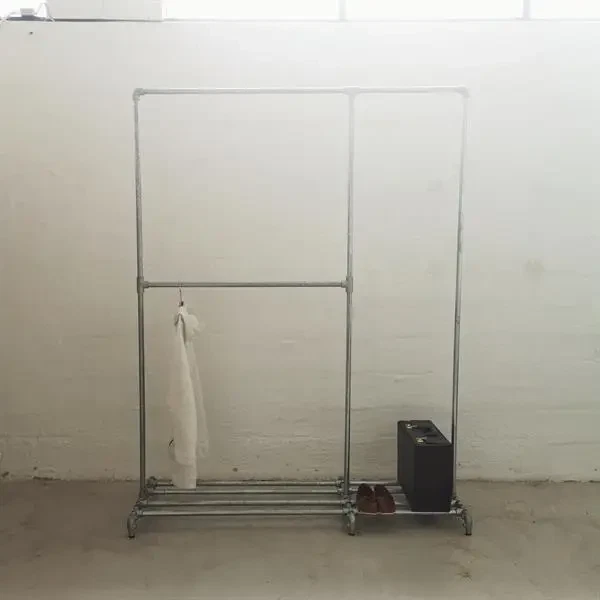 Denne garderobe serie er meget rå og rustik. Tøjstativer af vandrør / jernrør / vvs rør er en stigende trend i boligindretning, og falder under stilen industriel design eller new york loft. Det nøgne og rå look passer godt til de nordiske og milde lyse indretningstendenser, som mange har derhjemme. Samtidig kan det skabe et godt modspil til en feminin indretning, og se meget flot ud på en drengeværelse eller teenageværelse.