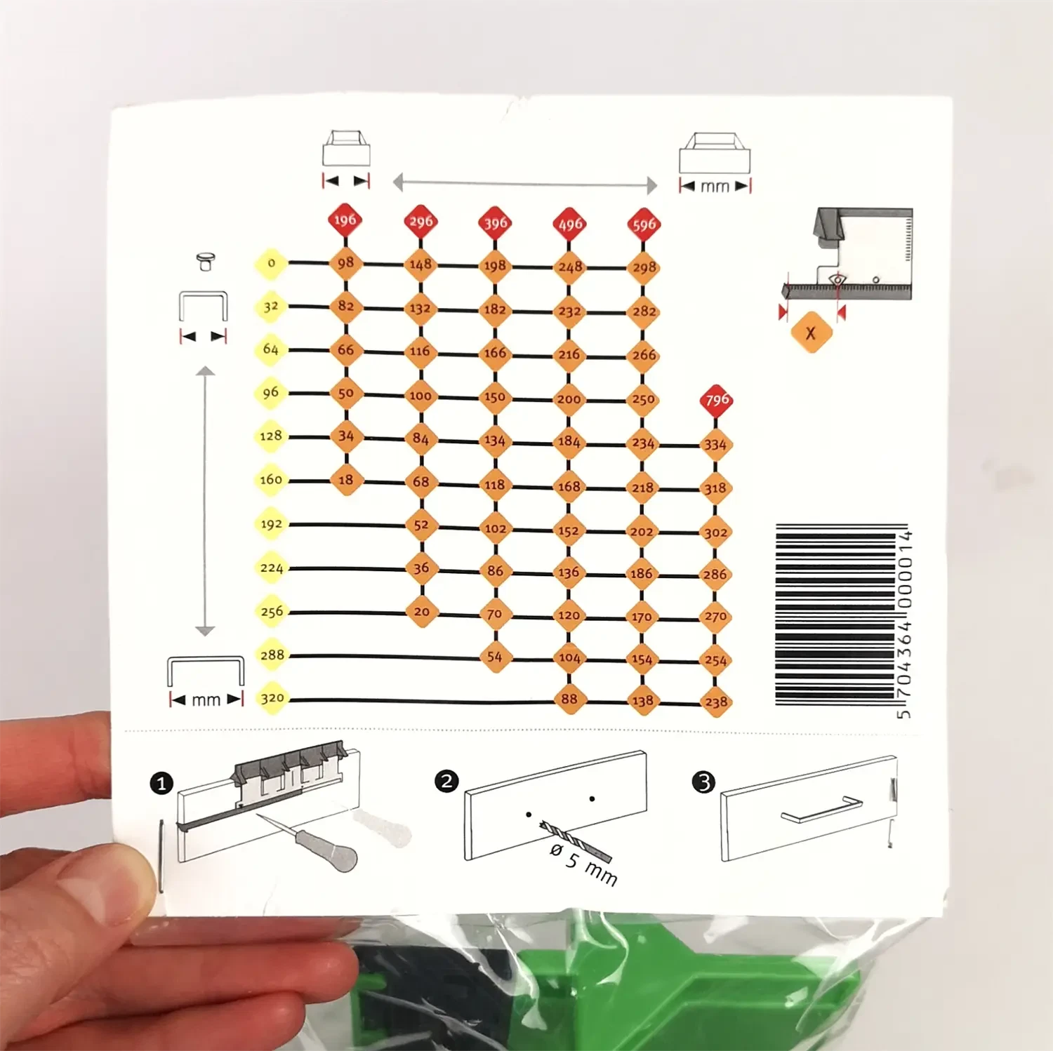 Bemærk: Der er mange huller i skabelonen, og man kan komme til at bore i det forkerte hul. Vi anbefaler derfor at markere de rigtige huller med lidt malertape. Så undgår du fejl.