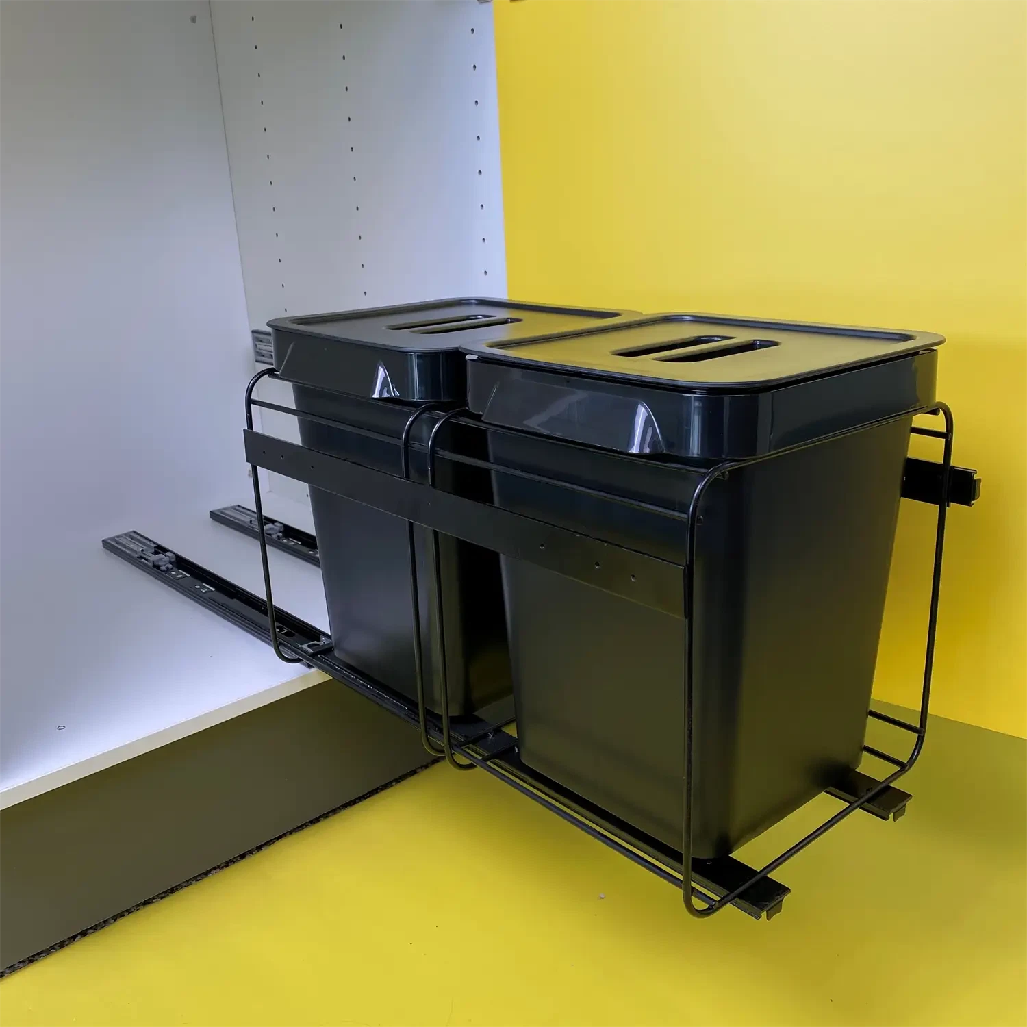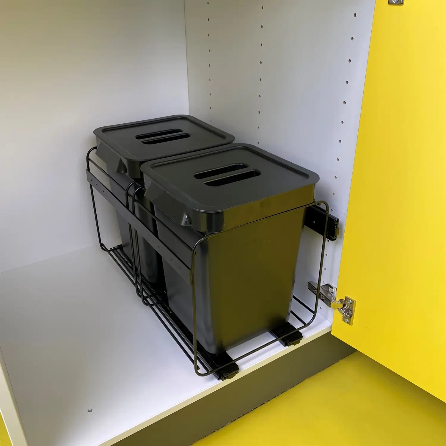 Skanitek SORTI 45/2 er et udtrækssystem med 2 x 11 liters spande med hank og låg samt en skillevæg, som gør det muligt at dele spanden op, så du får 2 rum på hver 5,5 liter i 1 spand.