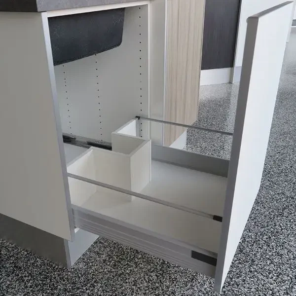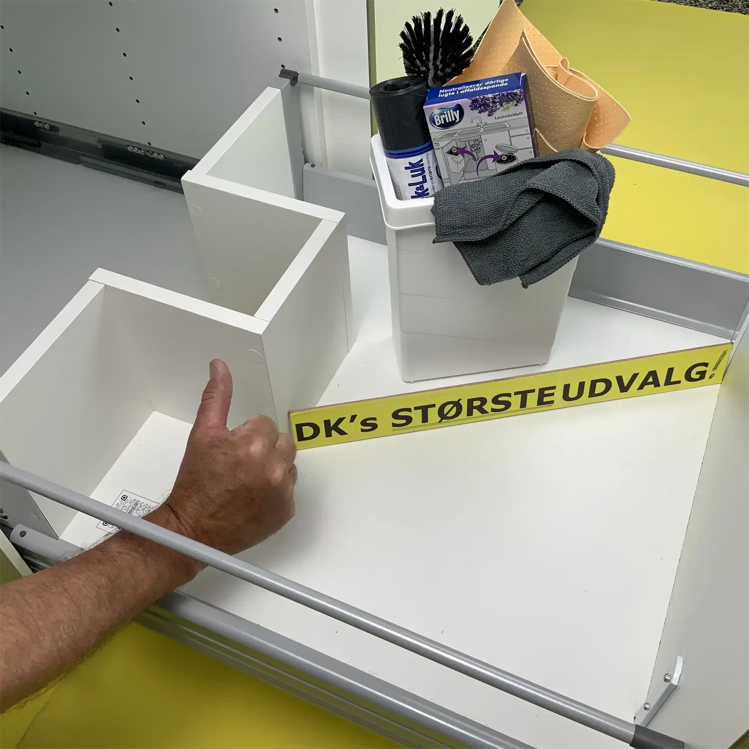 Her har du muligheden for at få lavet en smart skuffe til dit vaskeskab hvor du kan tage højde for rørene i skabet. Er du træt af din køkkenlåge med affaldsstativet på indersiden kan du ved at måle dit skabs indvendige mål få fremstillet en skuffe til frontudtræk, der passer lige til dit skab.
