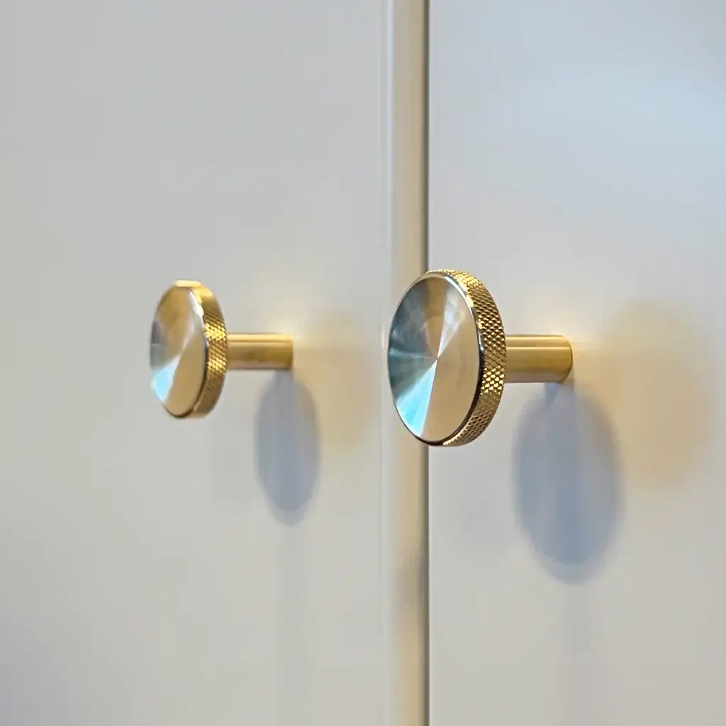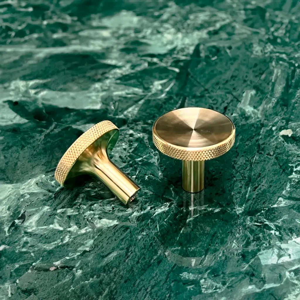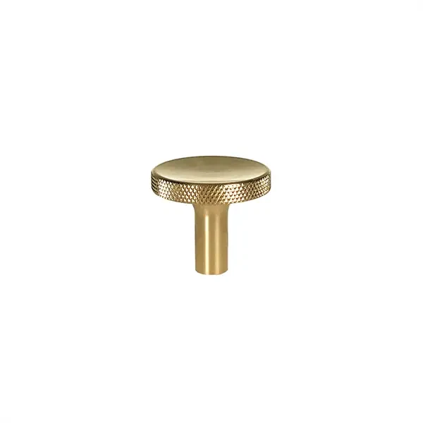 Fremstillet i massiv messing, som er et yderst stærkt materiale, er denne møbelknop robust og holdbar i lang tid. Designet med den glatte overflade og den riflede kant giver et sofistikeret og stilfuldt udtryk og et godt greb.