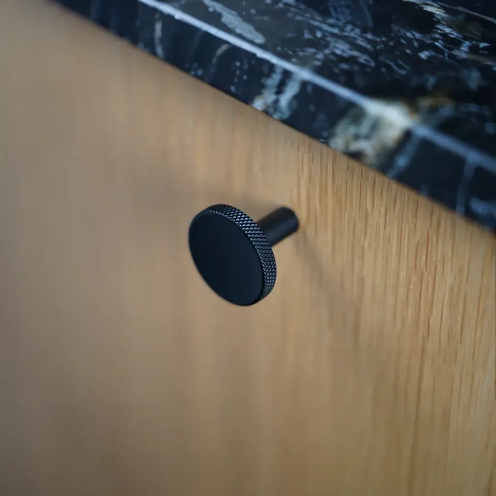 Fremstillet i massiv messing, som er et yderst stærkt materiale, er denne møbelknop robust og holdbar i lang tid. Designet med den glatte overflade og den riflede kant giver et sofistikeret og stilfuldt udtryk og et godt greb.