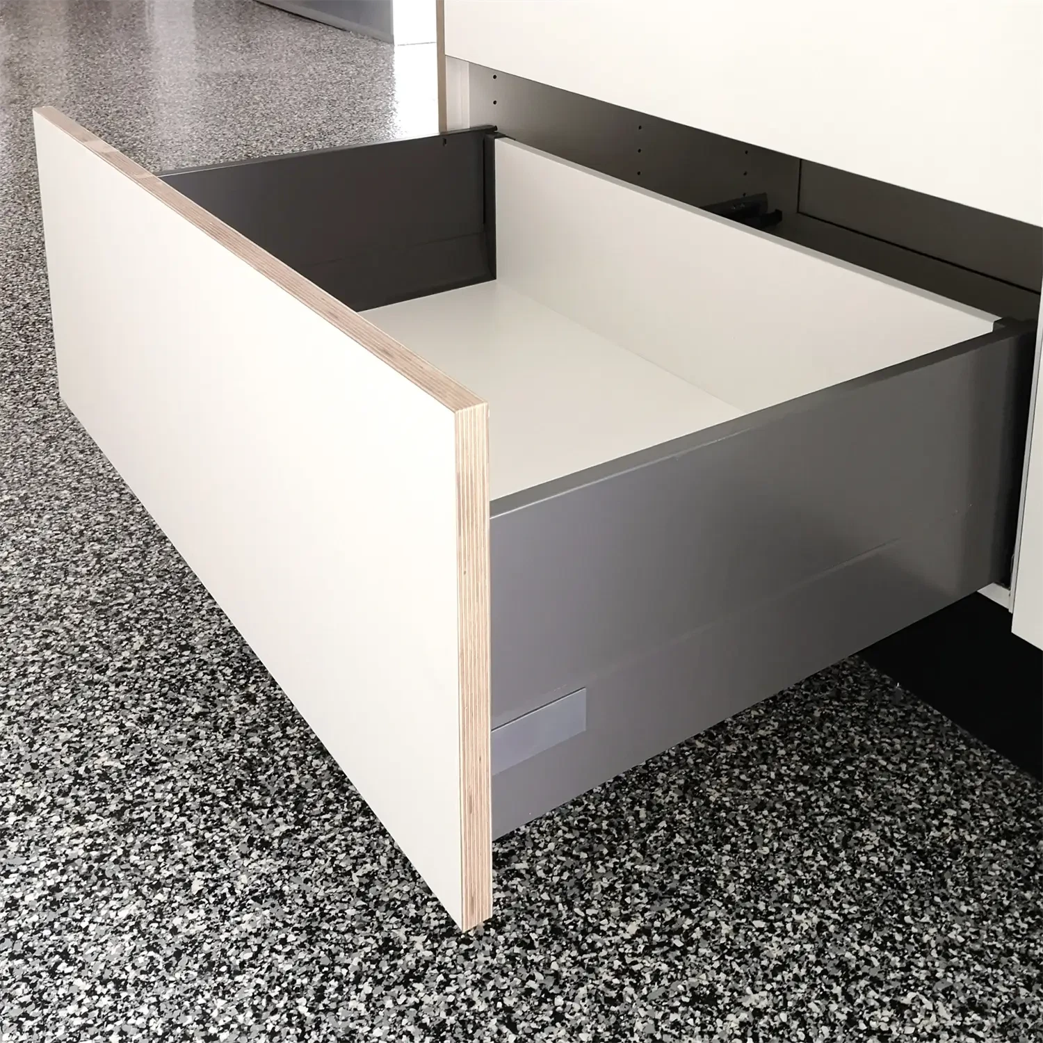TANDEMBOX A-DESIGN har den velkendte gode kvalitet fra sin forgænger, men er opdateret med en flot, retvinklet øvre kant på skuffesiden. Den fås desuden i to farver, hvid og antracit. Der er selvfølgelig fuldt udtræk så du kan se alt i skuffen, samt soft-close, i super kvalitet fra Blum.
