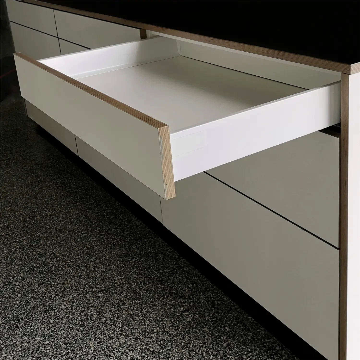TANDEMBOX A-DESIGN har den velkendte gode kvalitet fra sin forgænger, men er opdateret med en flot, retvinklet øvre kant på skuffesiden. Den fås desuden i to farver, hvid og antracit. Der er selvfølgelig fuldt udtræk så du kan se alt i skuffen, samt soft-close, i super kvalitet fra Blum.
