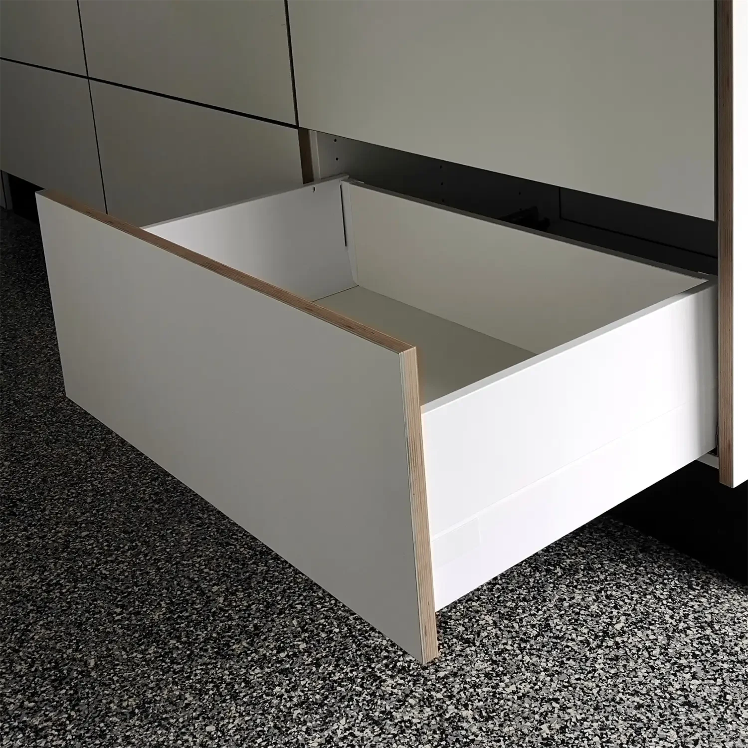 TANDEMBOX A-DESIGN har den velkendte gode kvalitet fra sin forgænger, men er opdateret med en flot, retvinklet øvre kant på skuffesiden. Den fås desuden i to farver, hvid og antracit. Der er selvfølgelig fuldt udtræk så du kan se alt i skuffen, samt soft-close, i super kvalitet fra Blum.