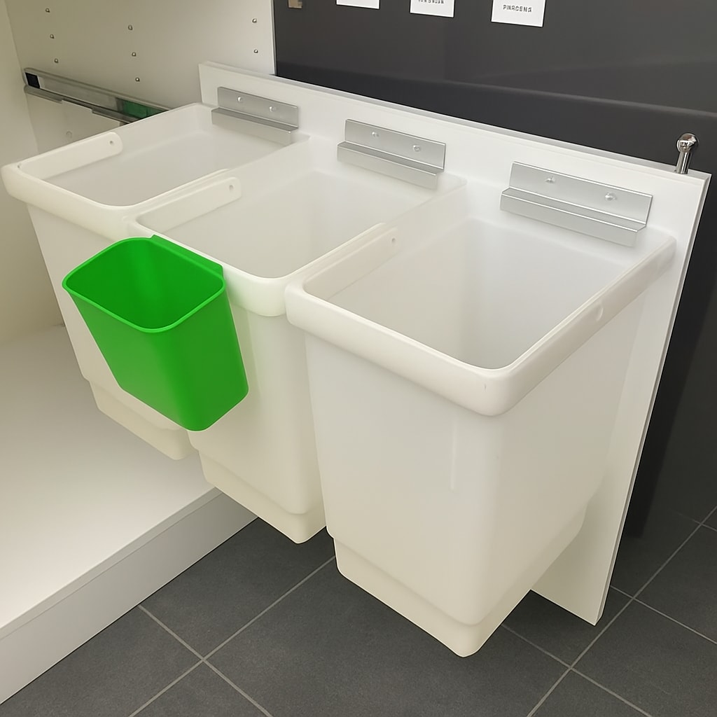 Pladen monteres direkte i skabet og giver dig fuld frihed til at vælge antal spande, størrelser og præcis placering – helt uden at blive begrænset af vandrør, afløb, kabler eller smalle skabe.