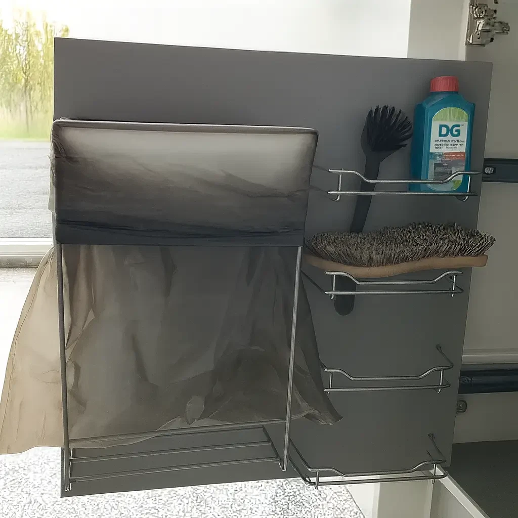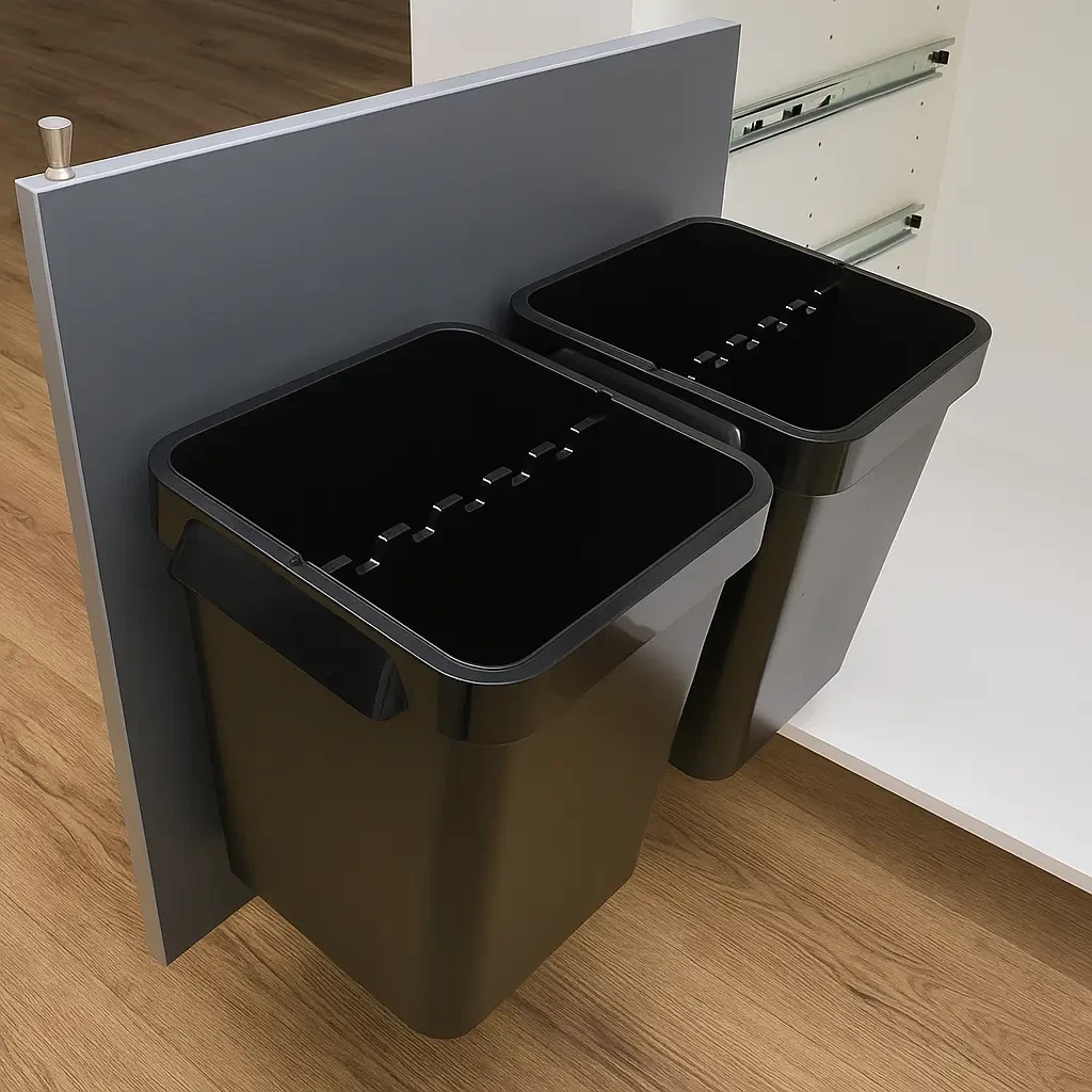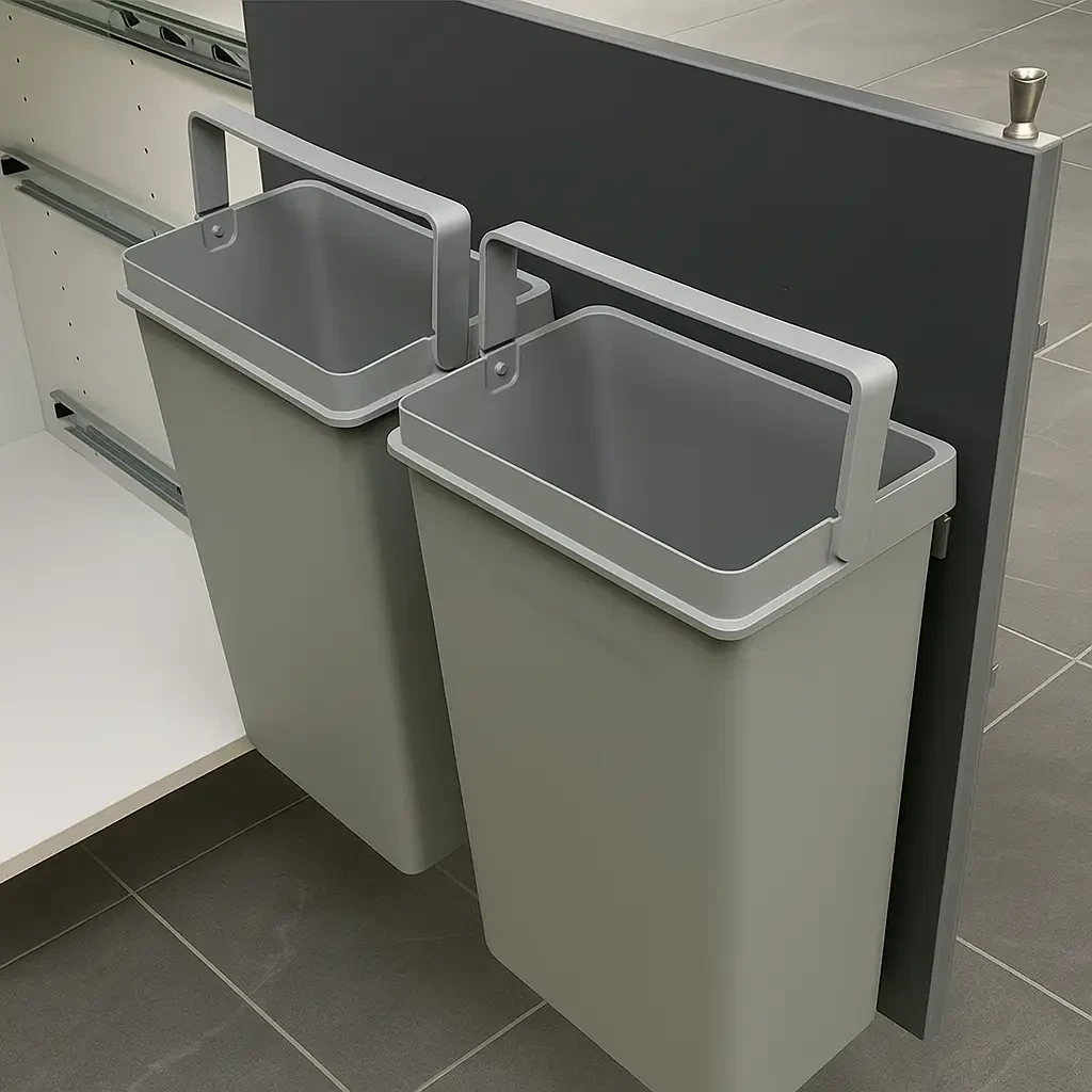 • Fleksibel placering: Monter affaldsspande på både den brede og smalle side – eller lav en L-formet løsning, hvis skabet kræver det.