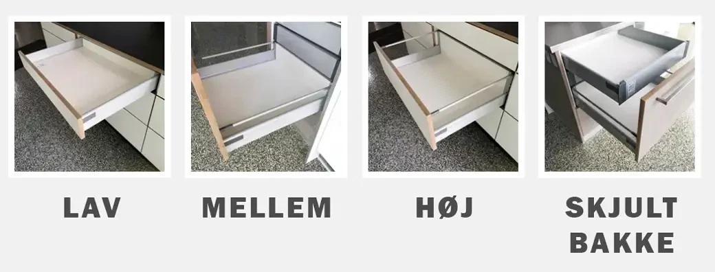 Med "skjult skuffe" eller "bakke" mener vi en skuffe, som leveres med en standard front, og kommer til at være gemt bag en låge eller en anden skuffes høje front.