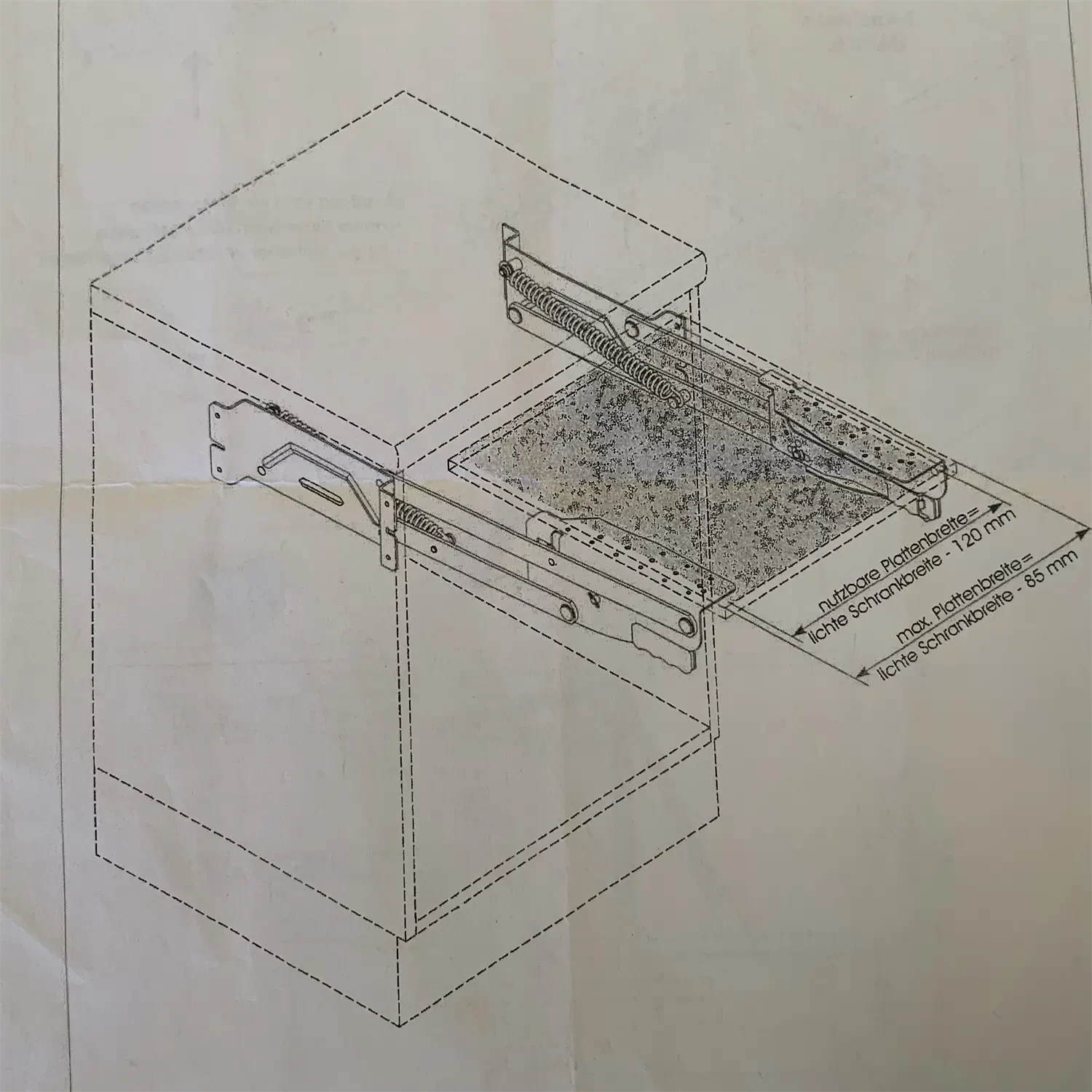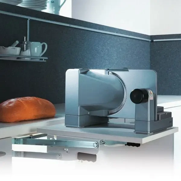 Beslaget løfter pladen med køkkenmaskinen ud af skabet op til bordhøjde, og skubbes efterfølgende på plads i skabet igen.